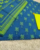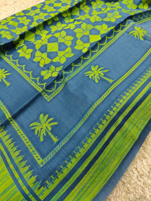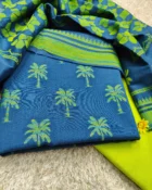 As seen in the image, the shirt is crafted from high-quality cotton jacquard, offering both comfort and a touch of texture. The deep blue shade serves as a beautiful backdrop for the eye-catching green palm tree print. The neckline and sleeves also feature a contrasting green and white striped detail, adding a sporty yet elegant touch.