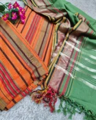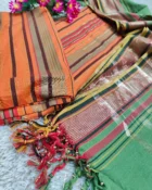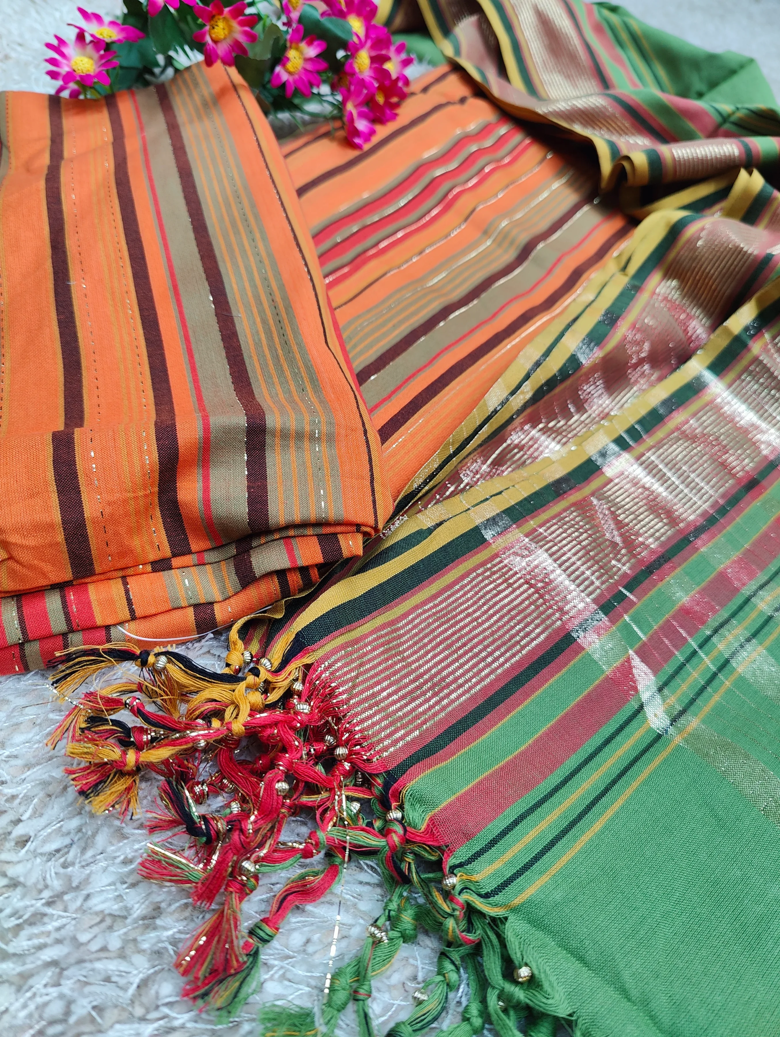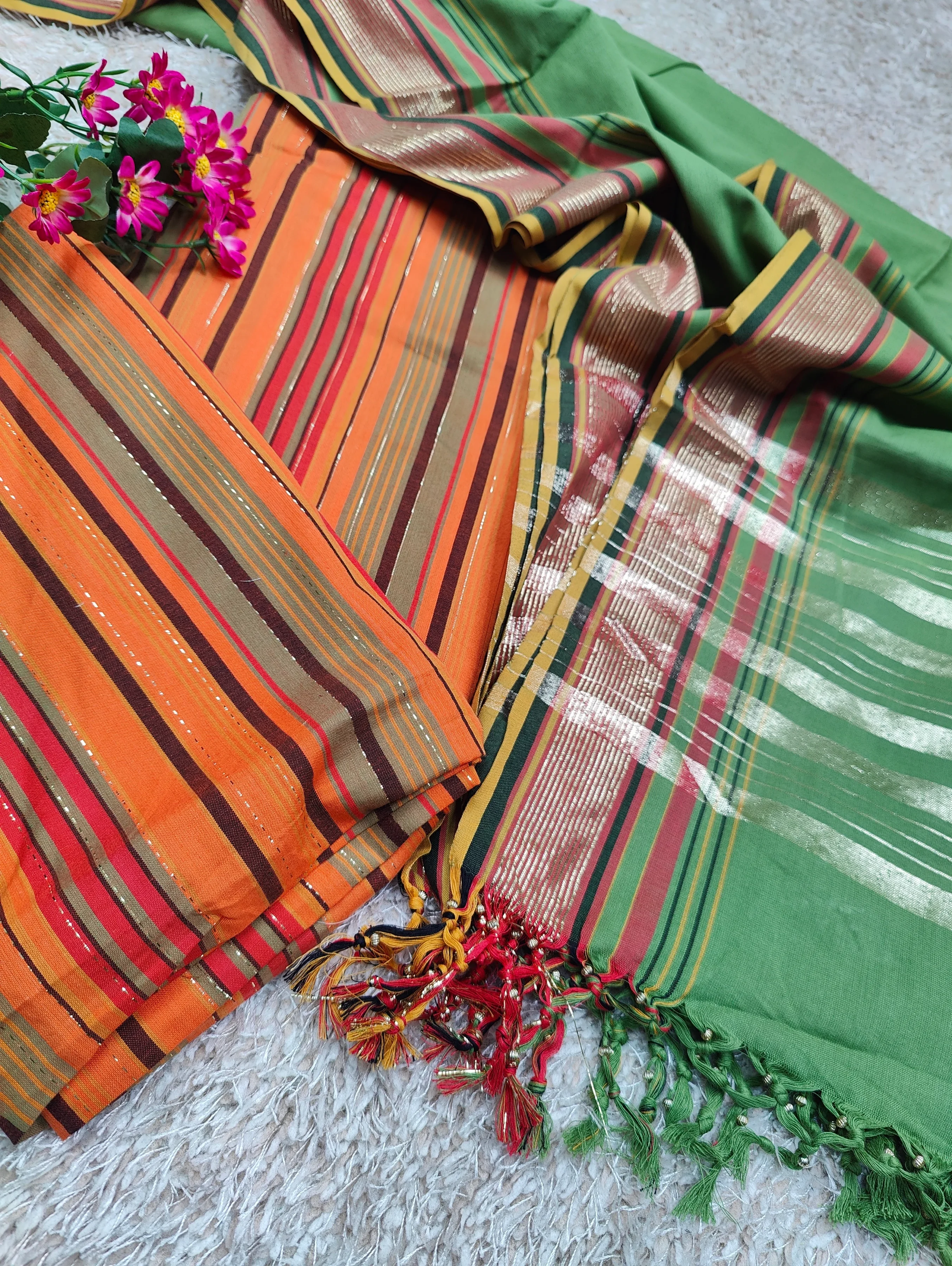 The shirt and trouser feature a playful line print that's both modern and eye-catching. The orange and green combination is fresh and summery, perfect for the Pakistani climate.